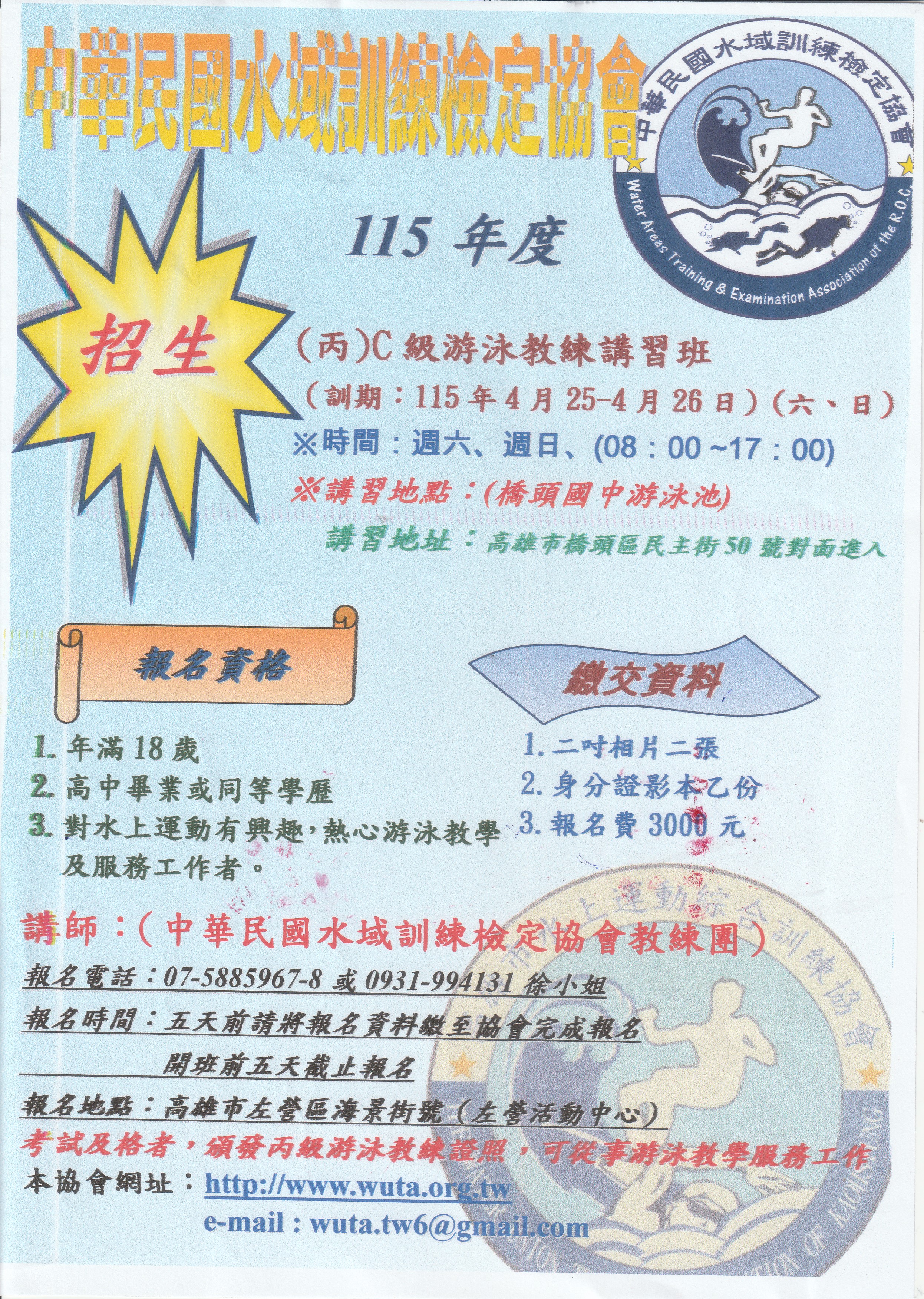 115年度丙(C)級游泳教練班熱情招生(四月)我要報名
